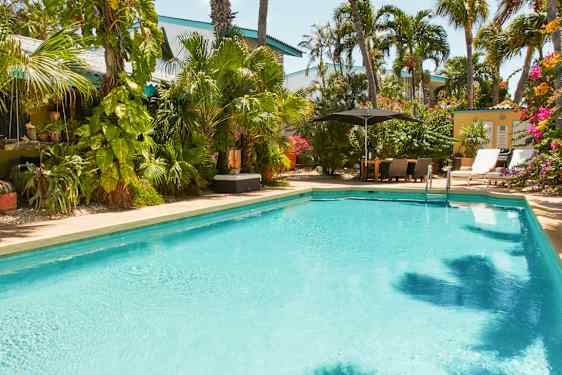 Paradera Park Aruba har et koselig, frodig bassengområde med solsenger og parasoller, perfekt for late dager.