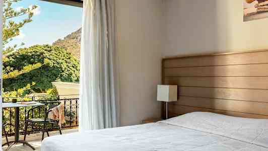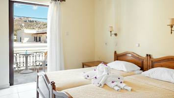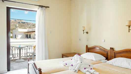 Kalydna Island Hotel tilbyr dobbeltrom og leiligheter. Dobbeltrommene ligger i hovedbygningen og har utsikt enten mot hagen eller mot fjellene og gaten. Leilighetene ligger i mindre bygninger rundt bassengområdet og alle vender mot hagen.