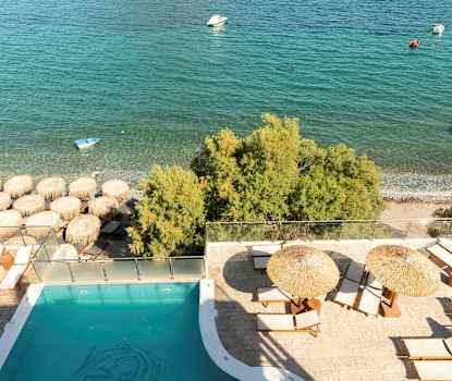 Hotellet har et fint bassengområde med solsenger og parasoller, og vakker utsikt over havet og naboøya Telendos. Vil du heller bade i havet, kan du ta trappen ned til stranden som ligger rett nedenfor hotellet. Vil du utforske andre strender i omgivelsene kan du rusle til nabobyen Mirties, der det ligger flere småstrender langs havet.