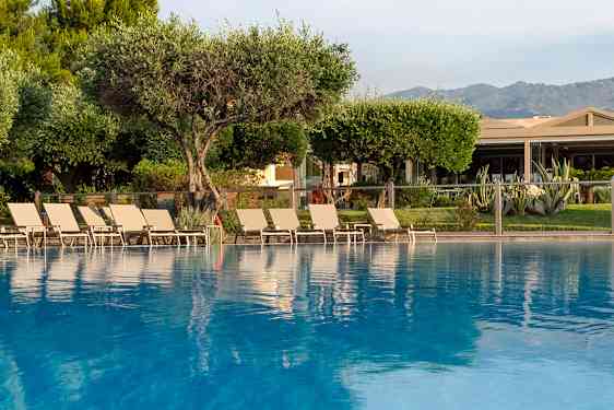 Mareblue Beach er et stort og herlig All Inclusive-hotell som ligger i rolige omgivelser i en dalside rett ved havet, omgitt av olivenlunder og pinjeskog. Hotellet har mange fasiliteter for både store og små gjester. Her finner du blant annet to innbydende bassengområder og flere restauranter og barer som holder åpent hele dagen. Siden All Inclusive er inkludert i prisen, kan du spise og drikke når det passer deg.