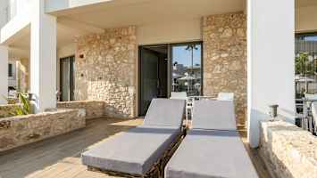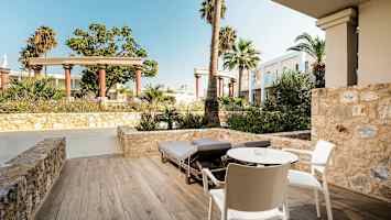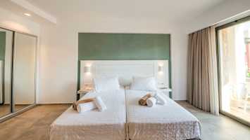 Dobbeltrom med terrasse mot bassengområdet, med mulighet for to ekstrasenger