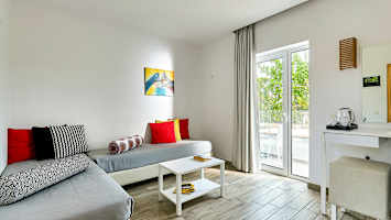 Blu Acqua har et stort bassengområde med solsenger, parasoller og bassengbar.
