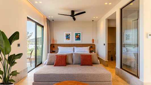 Rommene og juniorsuitene er moderne innredet med fokus på komfort og smarte løsninger. Her har du et behagelig sted å slappe av etter en dag fylt med tid ved bassenget, trening og kveldsunderholdning. Bestiller du en juniorsuite med plunge pool, får du også et lite privat basseng på terrassen din.