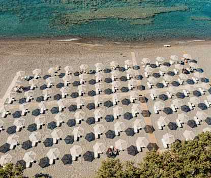 Stranden ved hotellet er en blanding av grovkornet, mørk sand og grus. Her er det gratis solsenger og parasoll for hotellets gjester. Ved kraftig vind er det fare for undervannsstrømmer og høye bølger. På stranden består havbunnen delvis av kalkstensplater som er synlige ved lavvann.