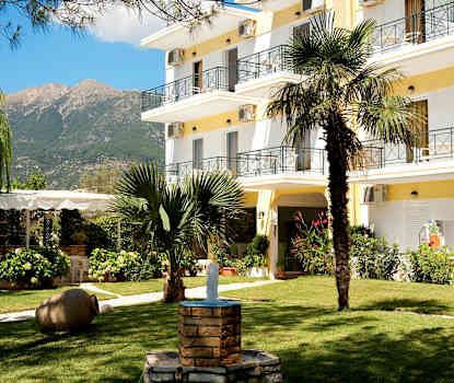 En fin strand på nordkysten utenfor Lefkada. Her er det utleie av solsenger og parasoller. Det er restaurant her. Det kan blåse en del på nordkysten.Agios Nikitas/Pefkoulia