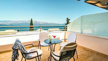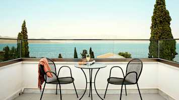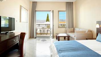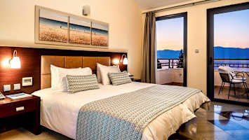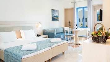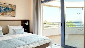 Porto Galini har lyse og trivelige rom med balkong, hvorav flere med utsikt mot havet.
