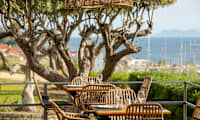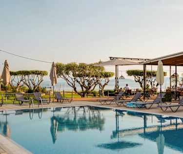 Innrammet av de to hotellbygningene ligger hotellets koselige bassengområde med solsenger og parasoller.