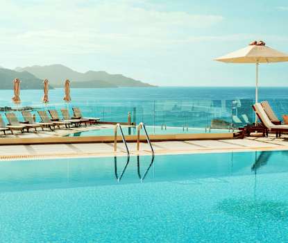 Hotellets bassengområde ligger foran hovedbygningen, på terrasser i forskjellige nivåer. Her kan du slappe av i solen og nyte avkjølende bad.
