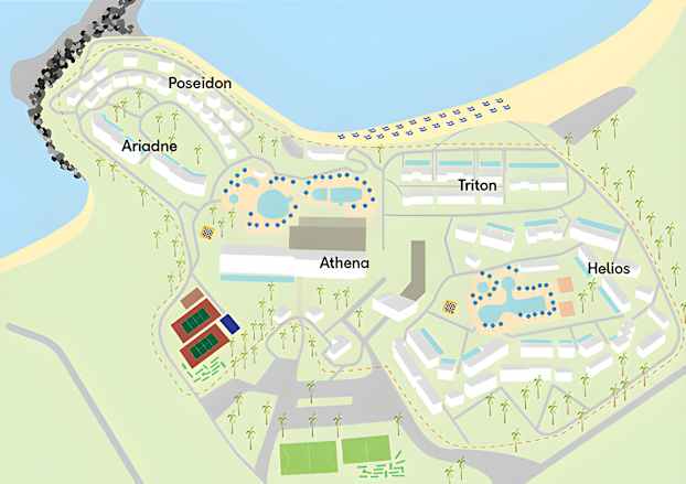 De fine bassengområdene er enda en grunn til at Sunwing Kallithea Beach er så populært. Det ene bassengområdet ligger ved hovedbygningen Athena og det andre ligger ved leilighetsbygning Helios. Her finnes det babybasseng som er 30 cm på det dypeste, og svømmedyktige barn kaster seg gjerne ut i det store eventyrbassenget med viker, bukter og skrå bunn. Det er dessuten vannsklier på begge bassengområdene – for ekstra morsom bassenglek.