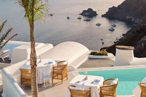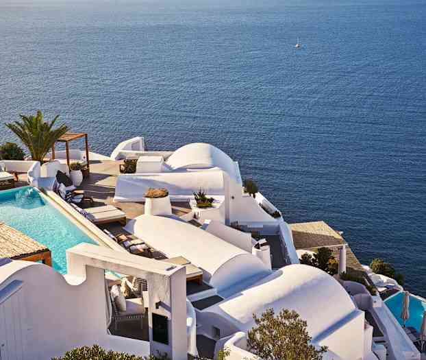 Høyt oppe på en klippe med vidstrakt utsikt over Egeerhavet ligger det eksklusive Katikies Hotel – en fredelig oase for deg som søker avslapning, komfort og førsteklasses service. Her bor du bare en kort spasertur fra de sjarmerende smugene i Oia, i en elegant og rolig atmosfære der hver detalj er nøye gjennomtenkt.