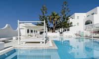 Hotell Daedalus ligger midt i hjertet av Fira, omgitt av duftende hager og palmetrær. Hotellet kombinerer tradisjonell arkitektur med moderne fasiliteter