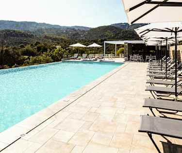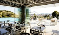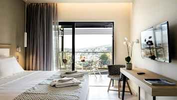 Hotellet har et fint bassengområde med utsikt mot frodig natur og sentrum av Skiathos.