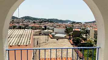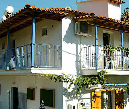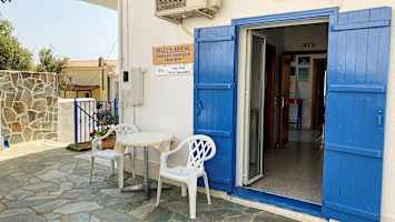 Nærmeste strand er Megali Ammos, som har grovkornet sand. Her er det solsenger til leie, vannaktiviteter og spisesteder.