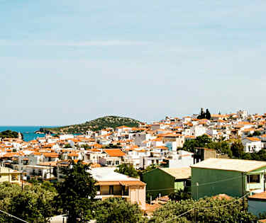 Det er ingen strender inne i Skiathos by, men enkelte gjester velger å bade ved Bourtzi-halvøya. Det er også mulig å ta turen til Siferi og Megali Ammos som ligger rett utenfor bykjernen. Siferi er en mindre strand der det ligger et par spisesteder og det er solsenger til leie. Megali Ammos er en lengre, grovkornet sandstrand der det er et godt utvalg av tavernaer og kafeer. I begynnelsen av sesongen, fram til midten av juni, pågår tildeling av lisenser for utleie av blant annet solsenger, strandbarer og tavernaer. Dette kan medføre at disse fasilitetene ikke er tilgjengelige på stranden før tildelingen er avsluttet.