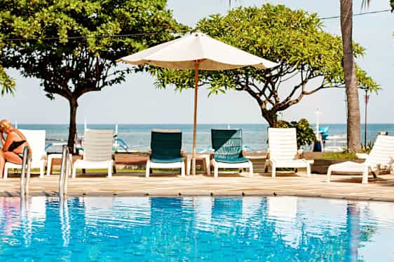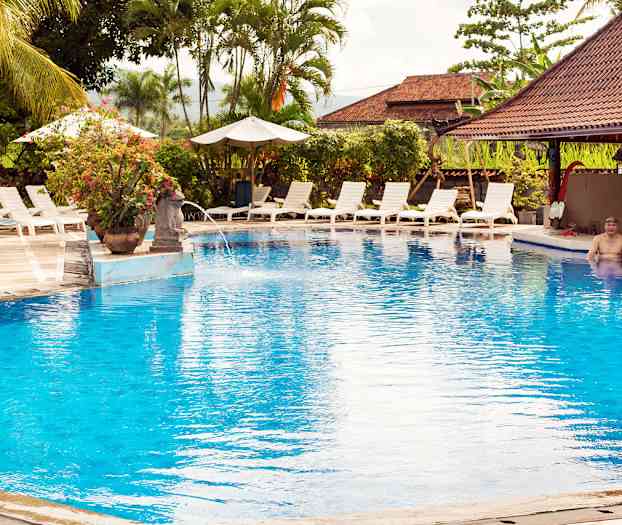 Hotellets bassengområde ligger foran stranden, og rundt bassenget er det solsenger og parasoller hvor du kan slappe av i løpet av ferien. På Aneka Lovina er det også en bassengbar og restauranter med lokale retter på menyen.
