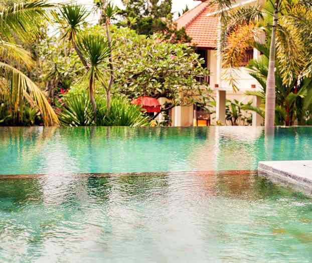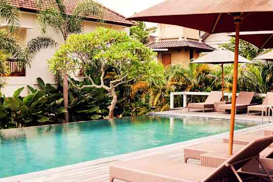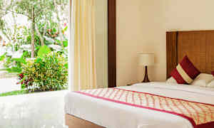 Atmosfæren på hotellet er fredelig og avslappende, og hvis du ønsker ekstra luksus i ferien, kan du bestille en villa med hage og privat basseng. Hotellet har et innbydende bassengområde med solsenger og parasoller, samt en restaurant hvor du kan smake på lokale retter fra Bali. Hvis du ønsker total avslapning i ferien, kan du nyte en herlig massasje eller en behandling på hotellets hyggelige spa.