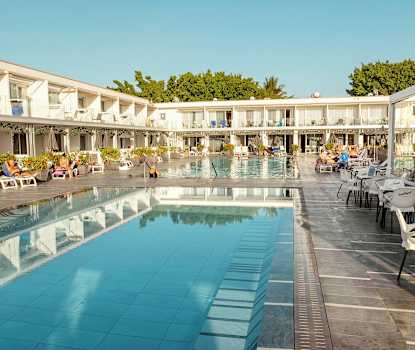 Apartamentos Lara har et innbydende bassengområde med to basseng, solsenger og parasoller. I tilknytning til bassengområdet ligger det også en høy terrasse med flott utsikt mot havet.