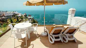 - Større balkong (ca. 45–57 m²) med parasoll og to solsenger med tyke madrasser