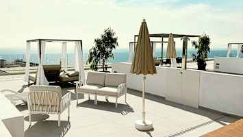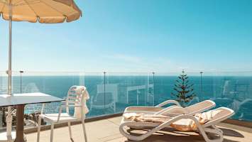 - Terrassen strekker seg ut til et felles soldekk på ca. 300 m², som ligger over restauranten og deles med tre andre leiligheter. Hver leilighet har en baliseng, sofagruppe og utedusj. På soldekket finnes også felles stoler og bord.