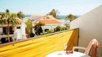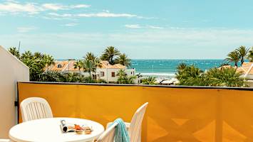 En mørk og finkornet sandstrand ved marinaen Puerto Colon nedenfor HOVIMA La Pinta Beachfront Family Hotel. Hit kommer det folk i alle aldre og fra alle land. Det er et godt utvalg av restauranter, barer og butikker i området. Stranden ligger i le for bølger og undervannsstrømmer, men vannet kan bli litt grumsete.Playa del Duque