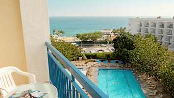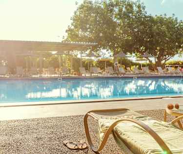 Marina har et koselig bassengområde med bassengbar, omgitt av beplantning.