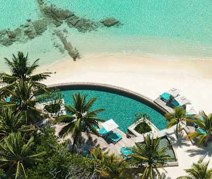 Stort og lekkert bassengområde hvor sand, hav og solterrassen møtes i herlig harmoni.