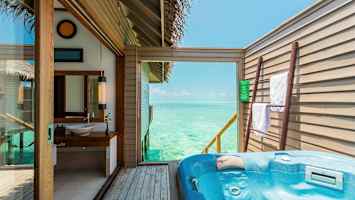 Står på påler i lagunen og nåes via brygger. Villaen har er stort bad, delvis åpent mot himmelen, med tilgang til en terrasse med boblebad og en trapp ned i vannet. Det er også en større terrasse med magisk utsikt, som har to solsenger/solstoler og bord. Jacuzzi Water Villas er ca. 85 m² inkludert bad og terrasser.