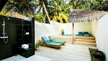 Ligger behagelig i skyggen fra trærne, litt lengre fra stranden. Terrasse med stoler og bord, og en privat loungedel med boblebad og solsenger/solstoler. Jacuzzi Beach Villas er ca. 80 m² inkludert bad og terrasser.