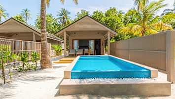 Villaene ligger på solnedgangssiden og har privat basseng. På terrassen ved bassenget er det to solsenger samt stoler og bord. Beach Pool Villas er ca. 86 m², bad og terrasser inkludert.