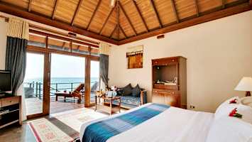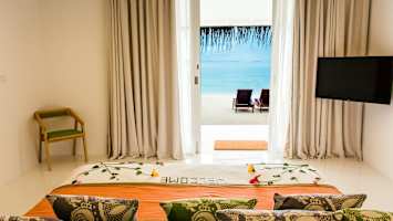 Står på påler i lagunen, så man kan gå rett ned i havet fra terrassen. Water Villas er ca 64 m² inkludert bad og terrasse.
