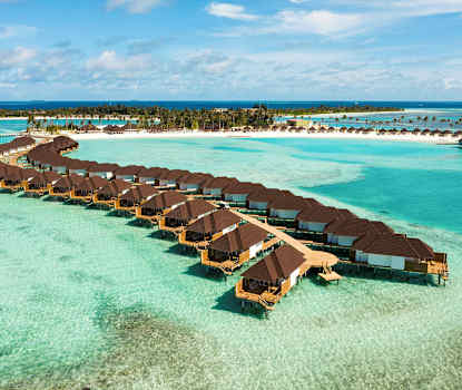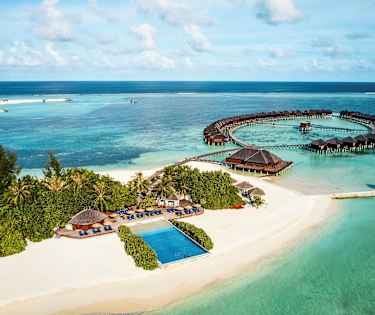 av kritthvite sandstrender og en knallblå lagune. Her bor man i fine dobbeltrom og villaer, hvor noen står på påler over lagunen. Hotellet er stort og består av tre separate øyer med broer