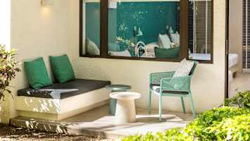 Dobbeltrom deluxe har en litt mer fargerik innredning over i mørkegrønt/mørk turkis, noe som skaper en lun atmosfære. Store vinduer og lyse detaljer gir allikevel et lyst inntrykk. Her kan du sitte på balkongen eller terrassen med en forfriskning fra minibaren og nyte suset fra palmene.