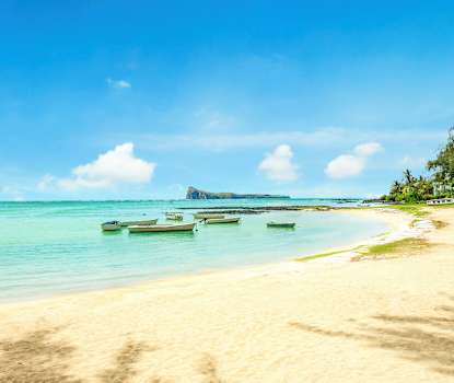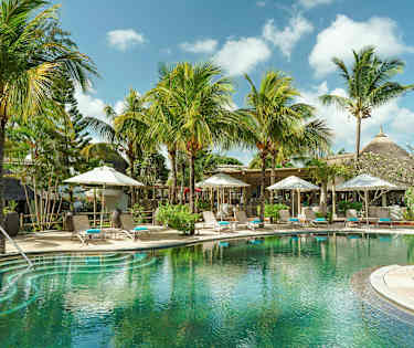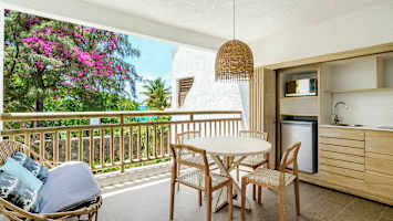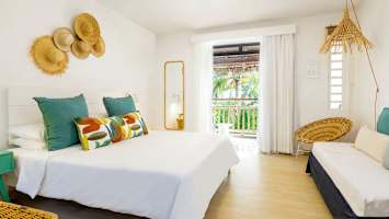Koselige rom med lys innredning og detaljer i lyseblått og grønt. Fra balkongen eller terrassen har du en herlig utsikt over omgivelsene, med vaiende palmer og frodig vegetasjon i hagen rundt hotellet.