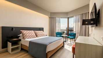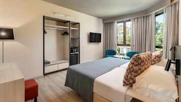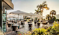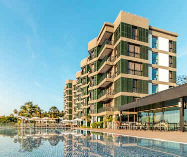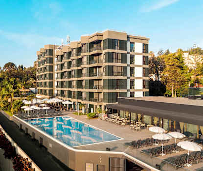 Hotellet har et fint bassengområde med solsenger og parasoller.
