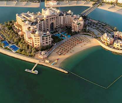 Romslige suiter med soverom og oppholdsrom. Balkong mot Marsa Malaz, The Pearl – Doha, hotellets private øy og Persiabukta. Suiten har en stor dobbeltseng (king size).