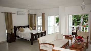 Enkle leiligheter med balkong og utsikt mot Mahés frodige omgivelser.