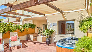 2-romsleilighet med stor terrasse og boblebad, mot hagen