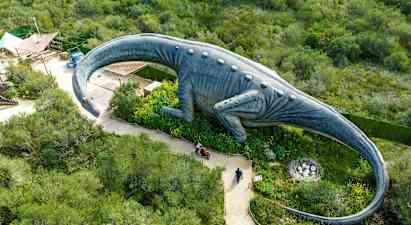 En stor dinosaurstatue omgitt av grønt sett ovenfra. (AI-generert tekst)