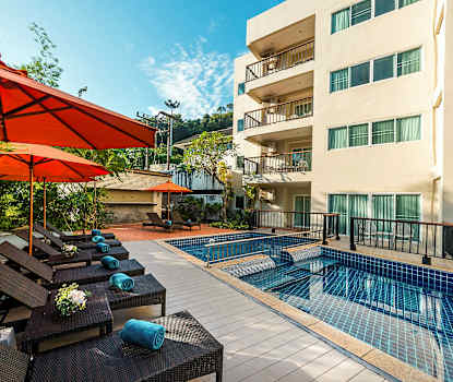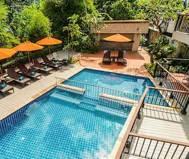 Lite bassengområde med solsenger og parasoller. Her er det også en bassengbar som serverer drikke i løpet av dagen.