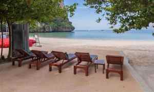 Feriested ved stranden, omgitt av hager og trær, og beliggende på Railay Beach i Krabi-provinsen.