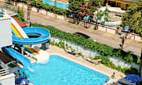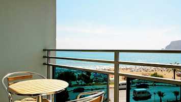 På stranden nedenfor hotellet tilbyr hotellet gratis solsenger og parasoller til gjestene sine. Du kommer til stranden via en gangtunnel eller ved å krysse en trafikkert vei.