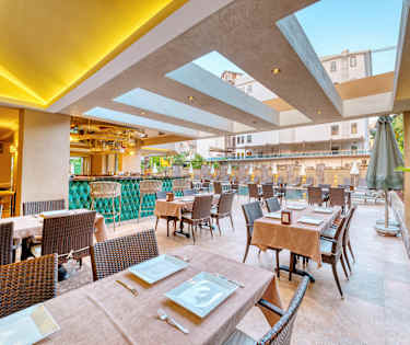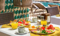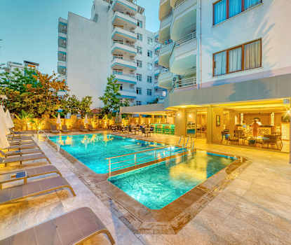 Rundt hotellets bassengområde kan du slappe av på en solseng eller under en parasoll.