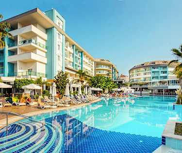 Hotellet har et stort bassengomrÄde med barnebasseng og bassengbar som passer perfekt for late dager i solen. I tillegg har hotellet sitt eget omrÄde pÄ stranden med solsenger og parasoller for gjestene sine.