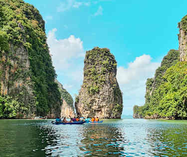 Når vi padler sammen med en guide inn i Phang Nga Bay, er vårt første stopp en av de mest berømte øyene der – Panak Island, også kalt James Bond Island. Øya er kjent fra den klassiske filmen "Mannen med den gyldne pistolen" og her får du muligheten til å forevige ferieminnet ditt med et fotostopp like ved. Guiden din vil lede deg gjennom et nettverk av grotter som fører til mystiske laguner, før det er tid for å slappe av med en thailandsk buffélunsj. Hold øynene åpne, for du kan støte på noen aper og flaggermus underveis. Vi fortsetter til Hong Island, der en uberørt lagune omgitt av klipper blir vårt siste stopp på utflukten. På vei tilbake til Ao Por-piren vil mannskapet vårt servere fersk thailandsk kylling, som vi nyter før vi begir oss tilbake til hotellene.