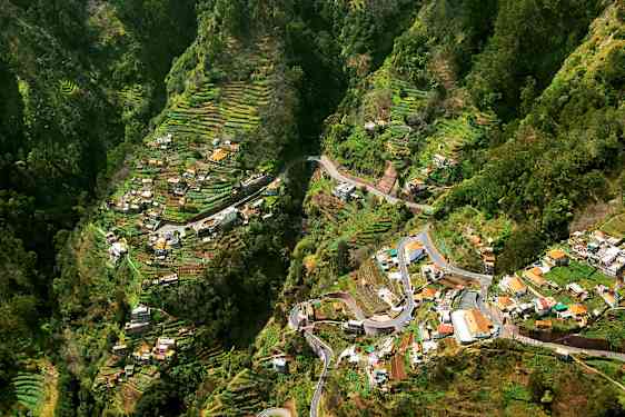 Deretter fortsetter vi mot Madeiras hjerte på en vei som tar oss gjennom et av de mest fascinerende landskap på øya. Veien slynger seg oppover gjennom eukalyptusskoger til utsiktspunktet Eira do Serrado. Her møtes vi av en praktfull panoramautsikt over grønnkledde fjellsider og nakne fjelltopper. Herfra ser du også ned i Curral das Freiras, Nonnenes dal, med sine mange landsbyer spredt nedover åssidene. Nede i dalen kan du kjøpe god kaffe og likør. Hvis du føler for det kan du besøke stedets vakre kirke og et museum på egen hånd.