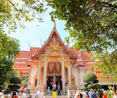 Ettermiddagen starter med at vi tar oss til Wat Chalong, Phukets største og eldste tempel. Dette er et munketempel som ligger på et over 200 år gammelt tempelområde. Wat Chalong består egentlig av tre templer, og under omvisningen får vi vite mer om buddhismen. Vi får blant annet se hvordan buddhistene benytter viktige symboler som lotusblomsten, røkelsen, stearinlysene og bladgullet.